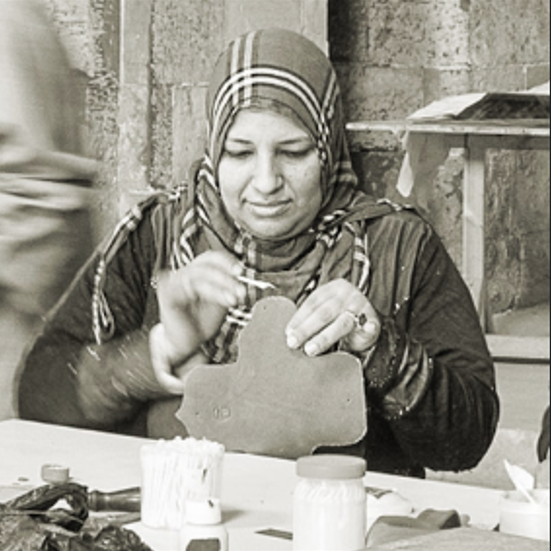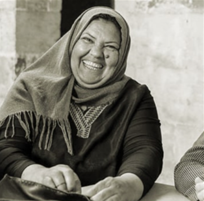 Umm Seif, as Saniya Salah El-Din is known in the neighbourhood where she lives, literally next door to the women workshop, has been with MISHKA since the very beginning. She mastered leather-working techniques and now is a leader for other women making leather goods.